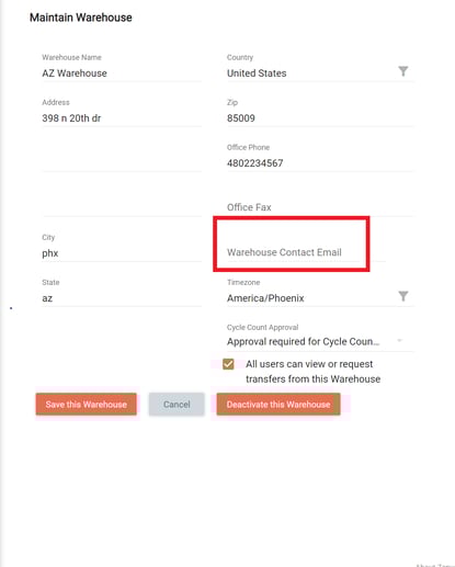 NOTE: The check box at the bottom of the page allows other users to request a warehouse transfer order from the warehouse, and also allows other Users to view the inventory in the warehouse from the Inventory page.